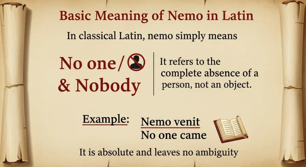In this complete article, you will learn the literal meaning of nemo in Latin, its grammatical role, origin, philosophical significance, famous uses in literature, how it influenced modern languages, and why it continues to be powerful today.